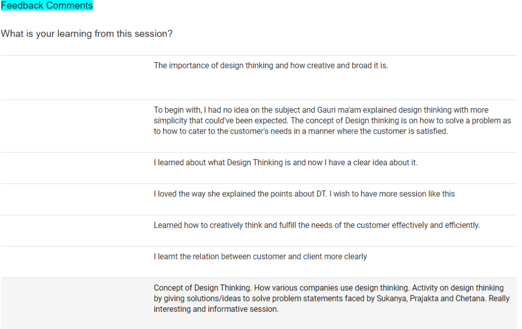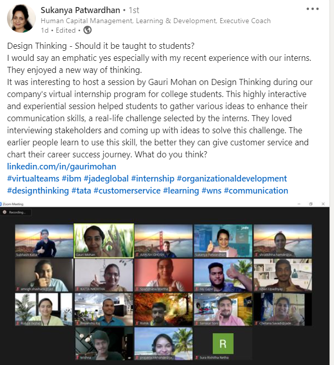 Sukanya Patwardhan Vice President Talent Development“Thank you so much for your excellent session on Design Thinking for our HR team and internship batch. You made complex concepts simple in an interactive manner with a real time exercise to solve a problem.(How might we communicate more effectively virtually?).Your examples on how design thinking is used in building products/services using virtual reality and augmented reality were spot on for our young IT professionals, you designed a session customised to the our needs . It demonstrates your commitment to give back to the young early career professionals.Very special thanks to you. We look forward to your continued support.”
