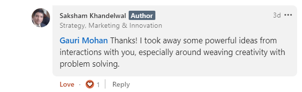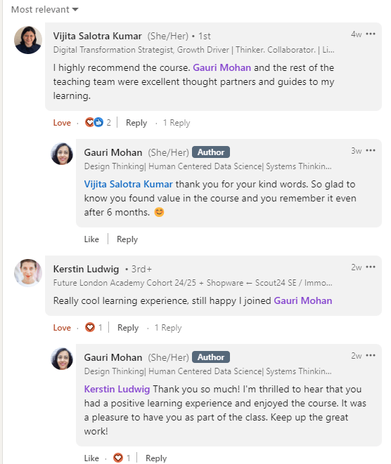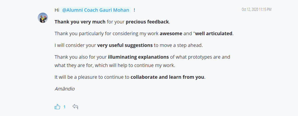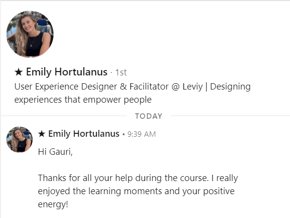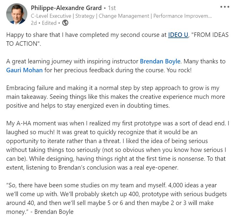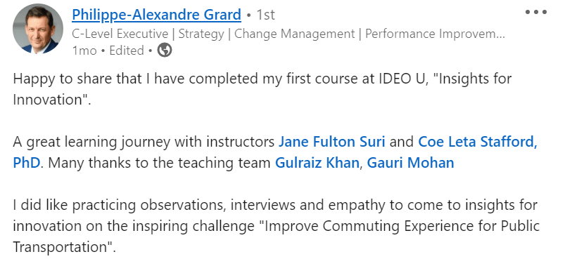 Philippe-Alexandre Grard, Stanford School of Bussiness Facilitator “Many thanks to the teaching team, Gauri Mohan for her precious feedback during the course. You Rock”