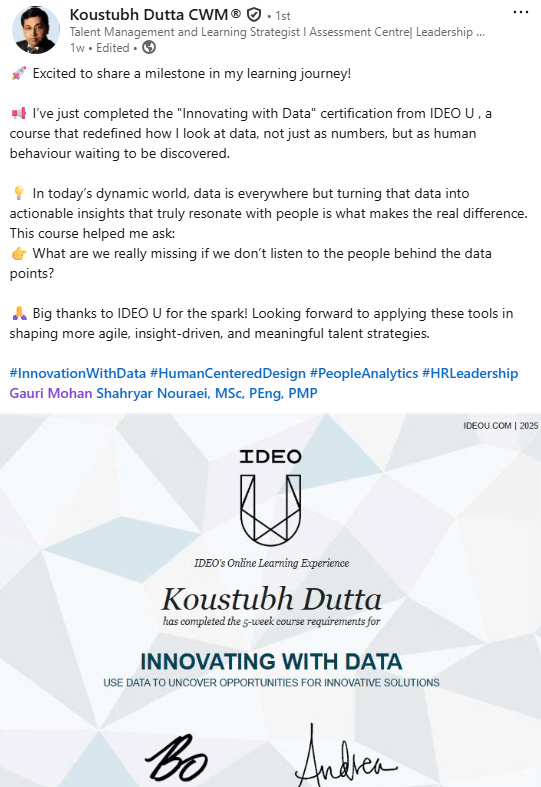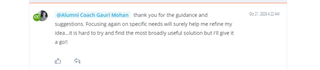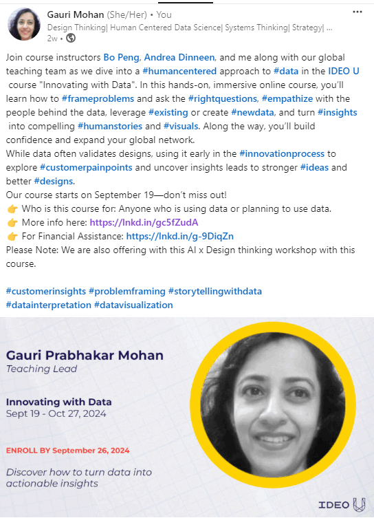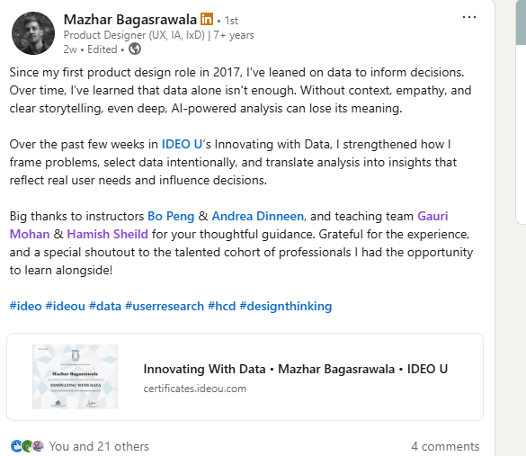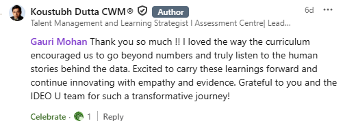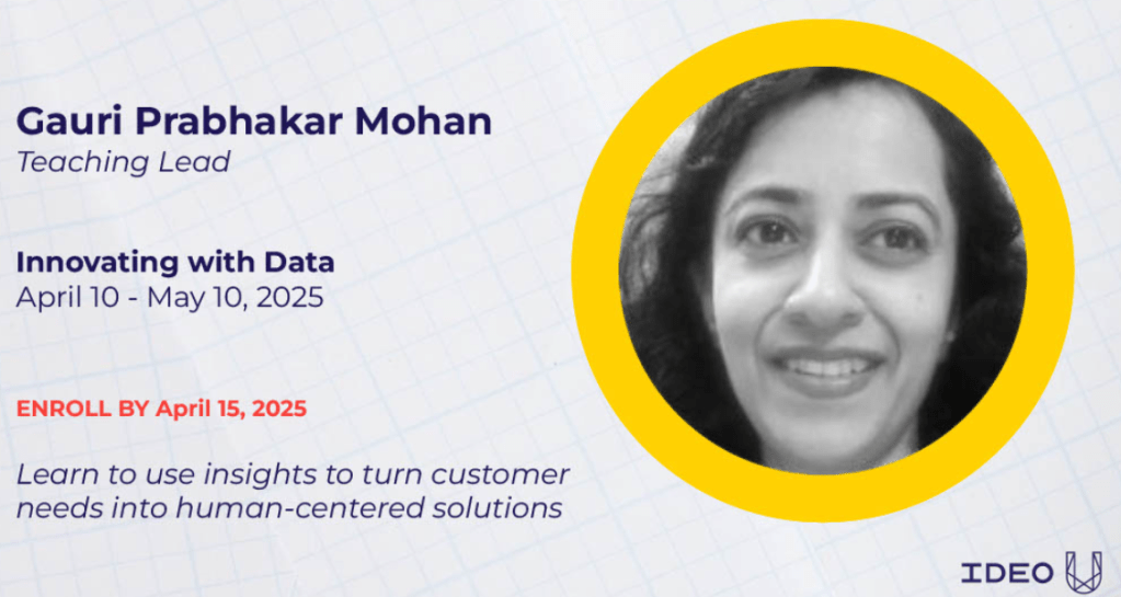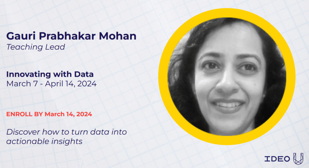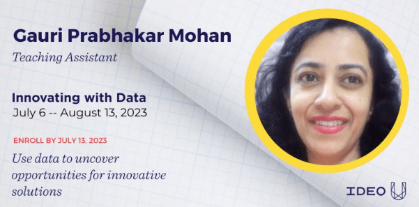 Mrinalini Majumdar, UX Designer at OPTUM “I’m very grateful to my Teaching Assistant Gauri Mohan for guiding me through Innovating with Data course and for taking time out of the busy schedules to go through all my assignments and providing me with amazing feedback. I truly appreciate it. 🫡“