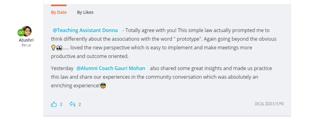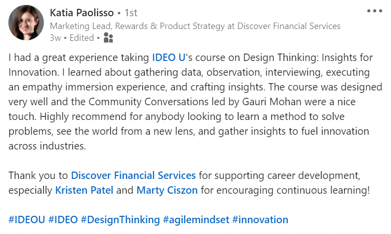 Katia Paolisso Marketing Lead, Rewards & Product Strategy at Discover Financial Services “The course was designed very well and the Community Conversations led by Gauri Mohan were a nice touch”
