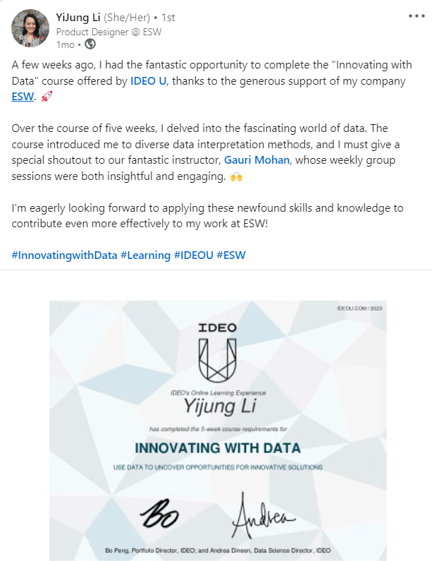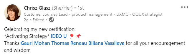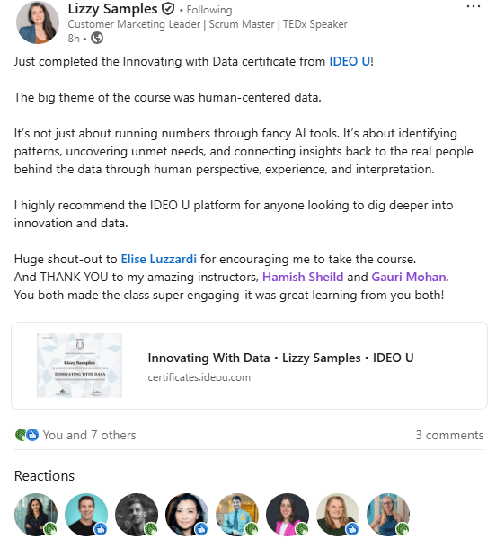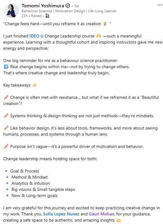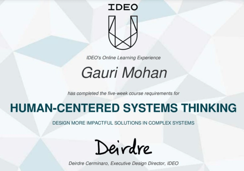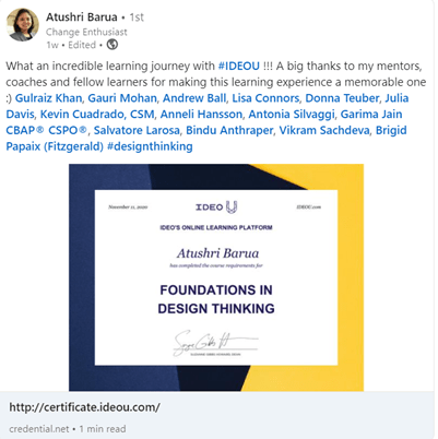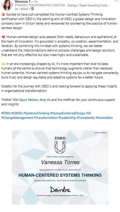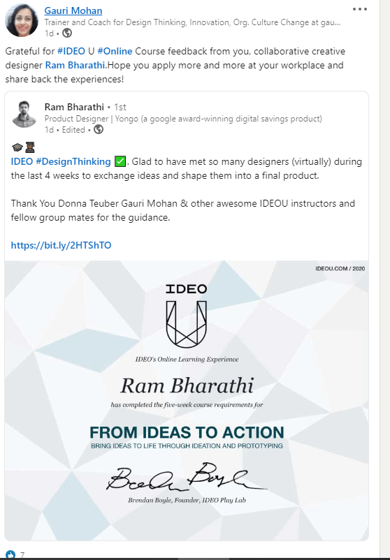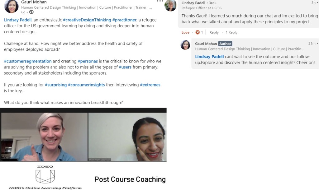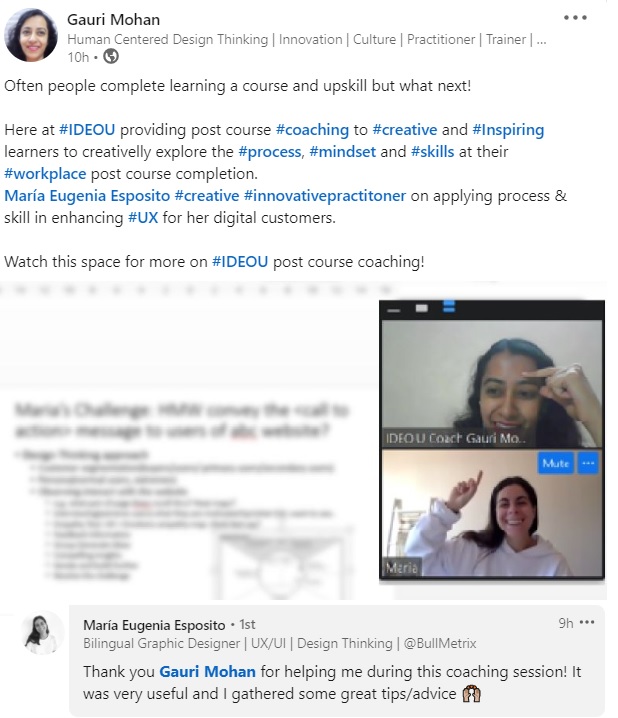 Anna Steel Nimble Ways of Working Enablement Manager Airbnb “Thank you to the amazing human Gauri for all the support in the IDEO U course From Ideas To Action”