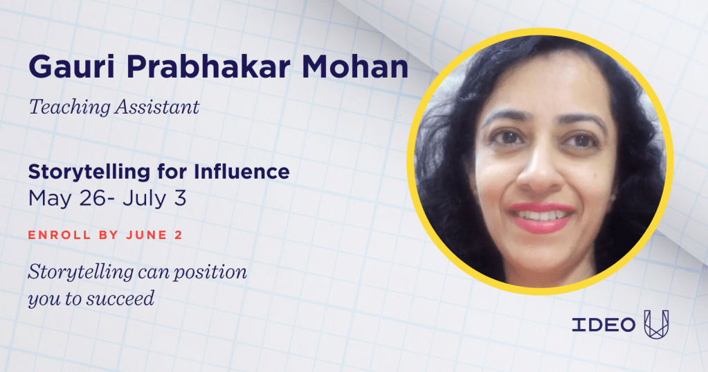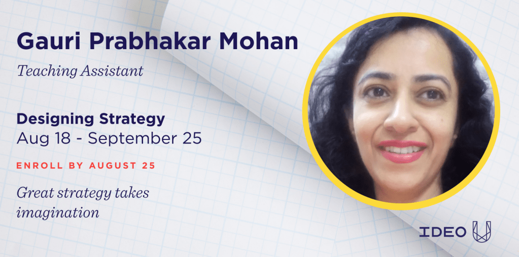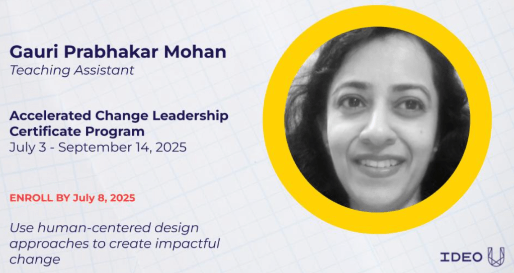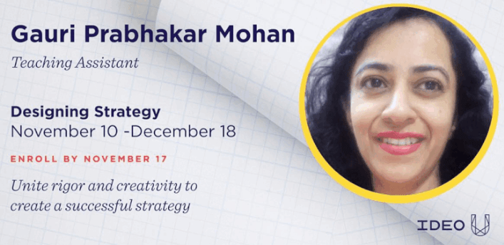 Digital Bank, Banco Bilbao Vizcaya Argentaria, Behavioral Science Consultant, Daniel Caceres Apolaya “Gauri is a very experienced and methodical mentor on the field of Designing a Strategy and having her as IDEO U coach was a great support. I’m currently managing a HR technological change in one of the biggest banks of Peru and she offered me not only great advice but also past insights on similar projects that she faced with valuable resources. I enjoyed our three 1 to 1 sessions because I could co-create solutions with her in a safety space getting honest feedback. Moreover our discussions were a reminder to put the user in the center of the change.”